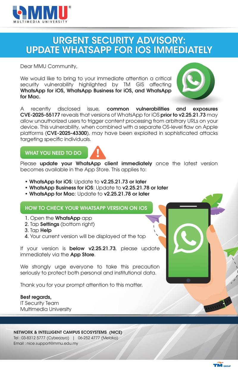 9 Sep 9 September 2025 Awareness URGENT SECURITY ADVISORY: UPDATE WHATSAPP FOR IOS IMMEDIATELY Read More Like